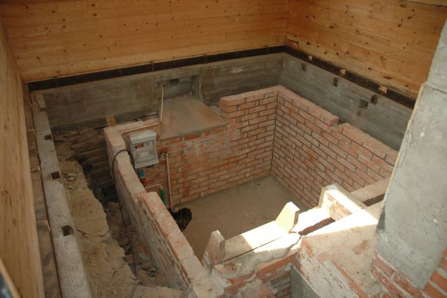 Med bjälklaget i köket borta syns matkällaren tydligt. De översta skiften på tegelmuren i matkällaren har avlägsnats för att få bättre svängrum när stämpet till betongvalvet ska byggas/rivas. El-centralens placering är temorär under renoveringen.