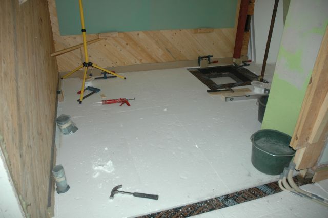 Efter mycket tålamodsprövande passande mot alla rör så är isoleringen i badrummet färdig.