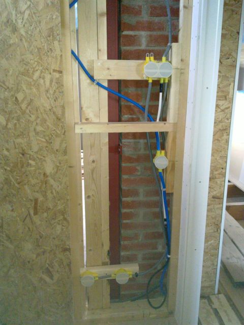 En del av eldragnigen till wc på plan 2. De nedersta två dosorna är till 2 handdukstorkar, mellandosan är till strömbrytare (KNX), de två övre är till timer (typ äggklocka) för handdukstorkar respektive reglage till golvvärme.