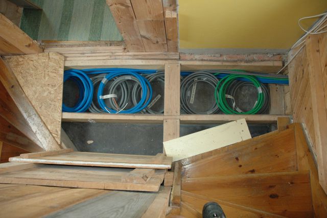 Början till kabeldike i hallgolvet på plan 3. Det mesta av all slang som ska ut i stugdelen på plan 2 går i hallgolvet på plan 3 och mynnar i takisoleringen på plan 2.