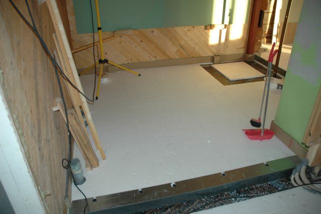 Här är badrummet färdigt för att lägga golvvärmeslingorna innan det blir armering och betong. I bakgrunden syns förstärkningssockeln med cellglas för accumulatortanken. I förgrunden är en plåt, som ska skilja betongplattorna åt, monterad. Nere till höger kommer elrören upp från centralen i matkällaren. Tanken är att huvudcentralen ska sitta i väggen mellan badrum och hall.